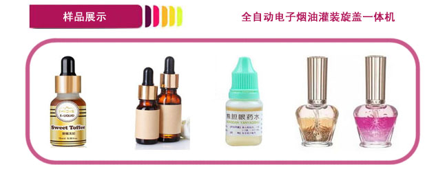 該機主要(yào)適用(yòng)於50毫升以(yǐ)內電子煙油、滴眼液、指甲油、眼影、精(jīng)油等產品的(de)自動灌裝、加塞和旋蓋。