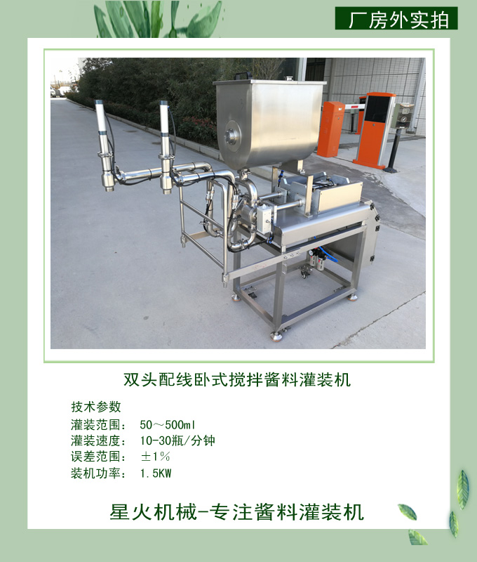 雙頭配線臥(wò)式攪拌(bàn)醬料灌裝機主要是針對粘稠並(bìng)帶有顆粒且濃度(dù)較(jiào)大的醬狀物料灌裝而設計的,如蘑菇醬(jiàng)、火鍋底料、香菇醬、豆瓣醬、鮮辣醬等灌裝的臥式攪拌醬料(liào)灌裝機,臥式攪拌,確保醬(jiàng)和油的充分混合,灌裝物(wù)料更均勻,結構簡單、精確度高、操作簡便。