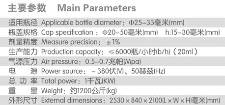 該設備為全自動灌裝(zhuāng)、旋蓋一體機,它將高粘度灌裝與常壓(yā)灌裝合(hé)二為一。在高粘度灌裝模式下,采用氣缸控製灌裝頭(機械限位),保證了計量的穩定性、精確度;在常(cháng)壓模式下,灌裝部(bù)分采用固定(dìng)流道參數(shù),控製灌料時間(jiān)實(shí)現不同的灌裝計量。灌裝過程均在(zài)PLC程序控製下進行,一切操作均在觸摸屏上完成(chéng)。旋蓋部分由供蓋係統、刮蓋、壓蓋、夾緊、輸瓶和旋蓋等(děng)完成自動旋蓋。整(zhěng)機(jī)具有運行(háng)穩定可靠、生產效率(lǜ)高、適應(yīng)性強(qiáng)的(de)特點。