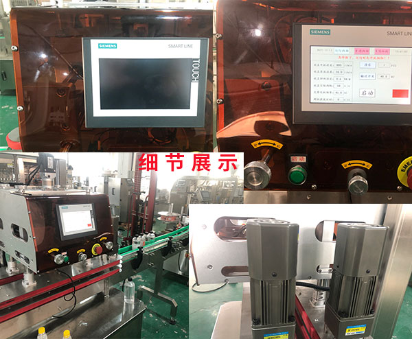 噴霧(wù)瓶自動旋蓋機適用於不同的瓶子的噴霧蓋旋蓋,灌裝頭插入瓶口灌(guàn)裝(zhuāng)功(gōng)能,自動上瓶,上(shàng)蓋(gài),自動旋蓋,機器速度無級可調,適用不同產品的灌裝要求。全自動觸摸屏操作設計,材料(liào),製造,裝配,調試符GMP要求整機凡(fán)接觸物料及(jí)某些相關(guān)部位均采用優良不鏽鋼製作整(zhěng)機運行平穩可靠,無噪音和其(qí)它汙染。需要清洗部位均選用快換裝置,拆洗方便台麵防水設計,方便用水清洗。