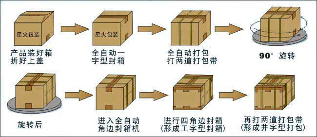 本包裝生產流水線主要操作流程:已裝好產品折好上蓋的產品箱從左邊的滾筒進入此流(liú)水線,進入第1台包裝機械:全自動一字型封箱機(進行一字型封箱)—→進(jìn)入第二台包裝機械:全自動打包機(打兩道打包帶)—→進入第三台包裝機械:90°旋轉(zhuǎn)機(jī)—→進(jìn)入第四台包裝機械:全自動角邊封箱機(進(jìn)入四角邊封箱,形成工字型封箱)—→進入較後的第五(wǔ)台包(bāo)裝機械:全(quán)自動打包機(打另外兩道的打包(bāo)帶,形成井字形打(dǎ)包)—→工字型封箱+井(jǐng)字型打(dǎ)包完成。