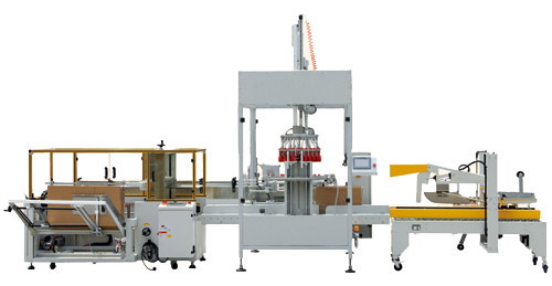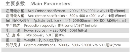 配套瓶裝生產線的後道全自動裝箱生(shēng)產。同時擁有多(duō)項國家技術專利,整機性能可靠,產能高,包裝效果美觀。